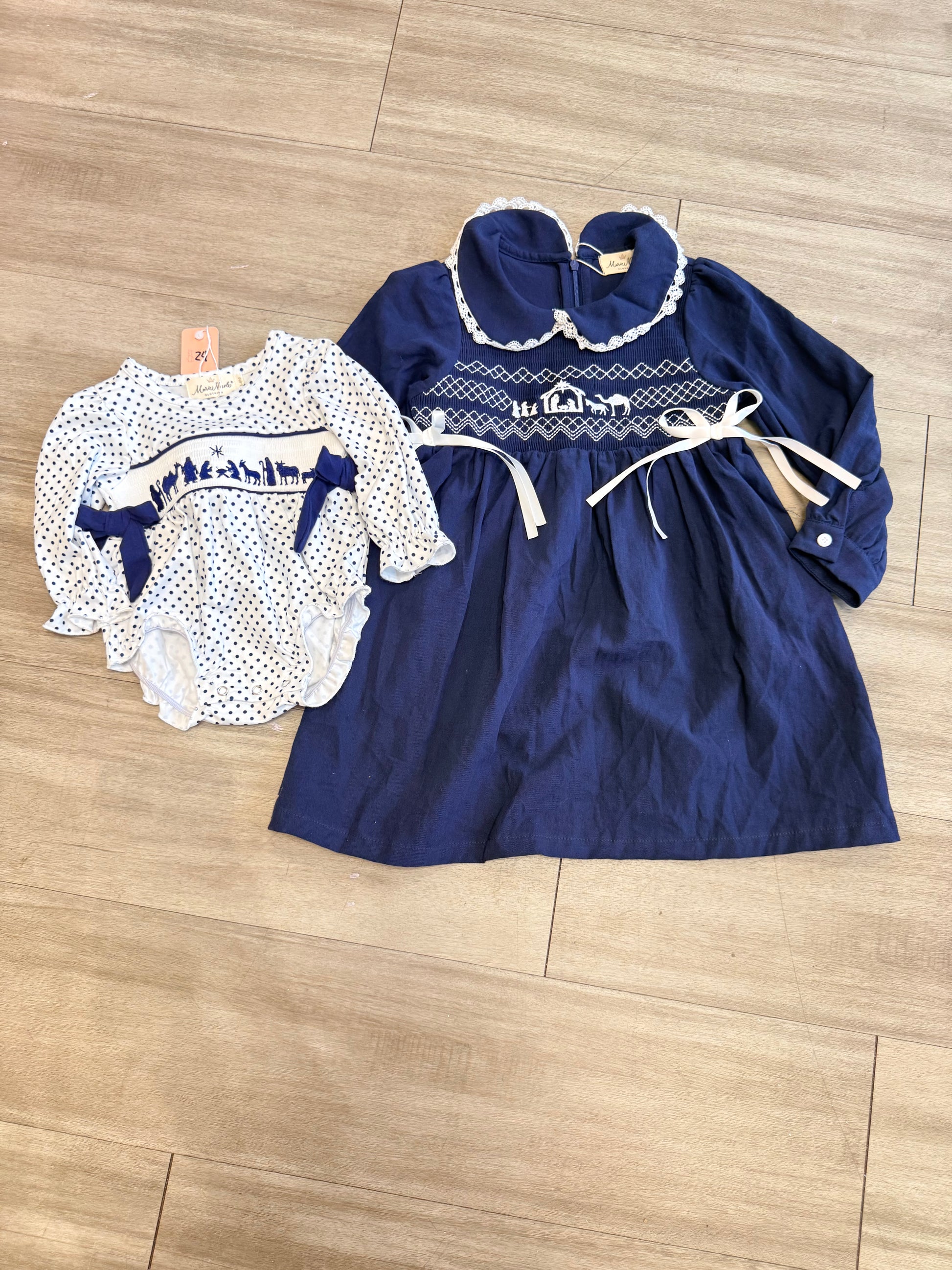 The Bethlehem Blessings Smocked Dress beautifully captures the true meaning of the season with its delicate white nativity smocking across the chest—featuring baby Jesus, Mary, Joseph, and the manger scene.