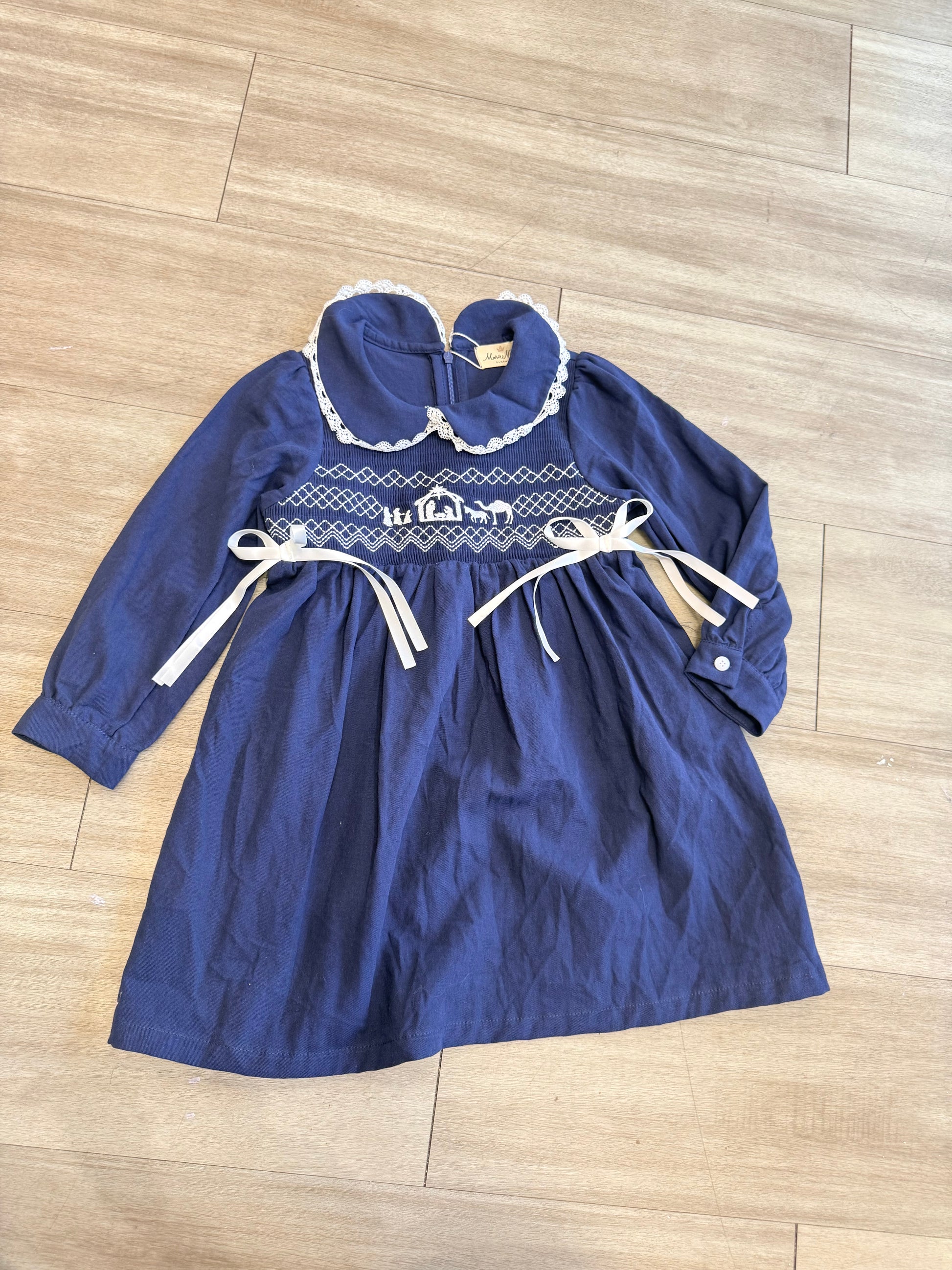 Crafted in deep navy with vintage-inspired details, it features a Peter Pan collar trimmed with scalloped lace, soft long sleeves, and dainty satin bows at the waist. The lightweight cotton blend makes it comfortable for church services, Christmas programs, photos, and holiday gatherings.