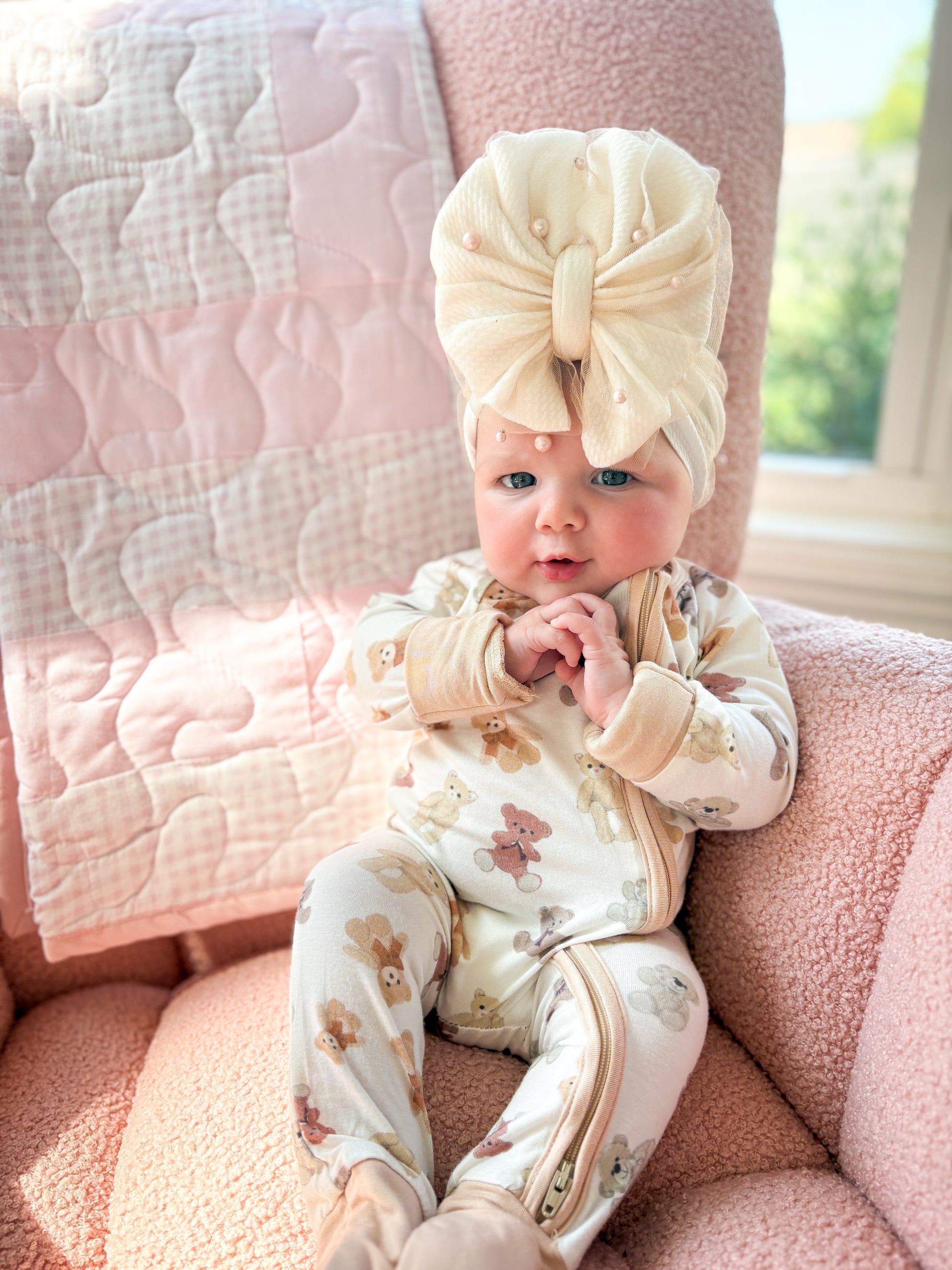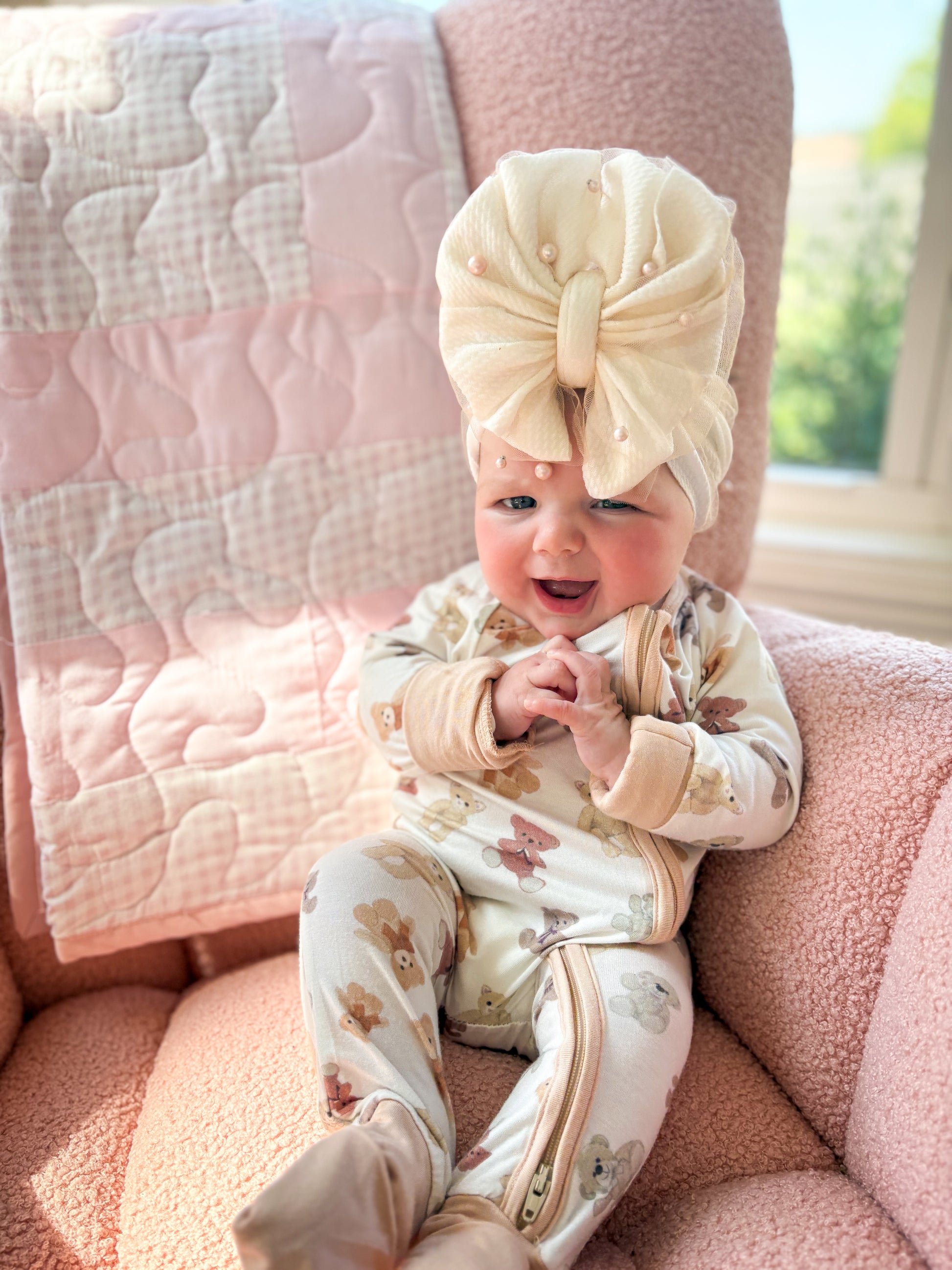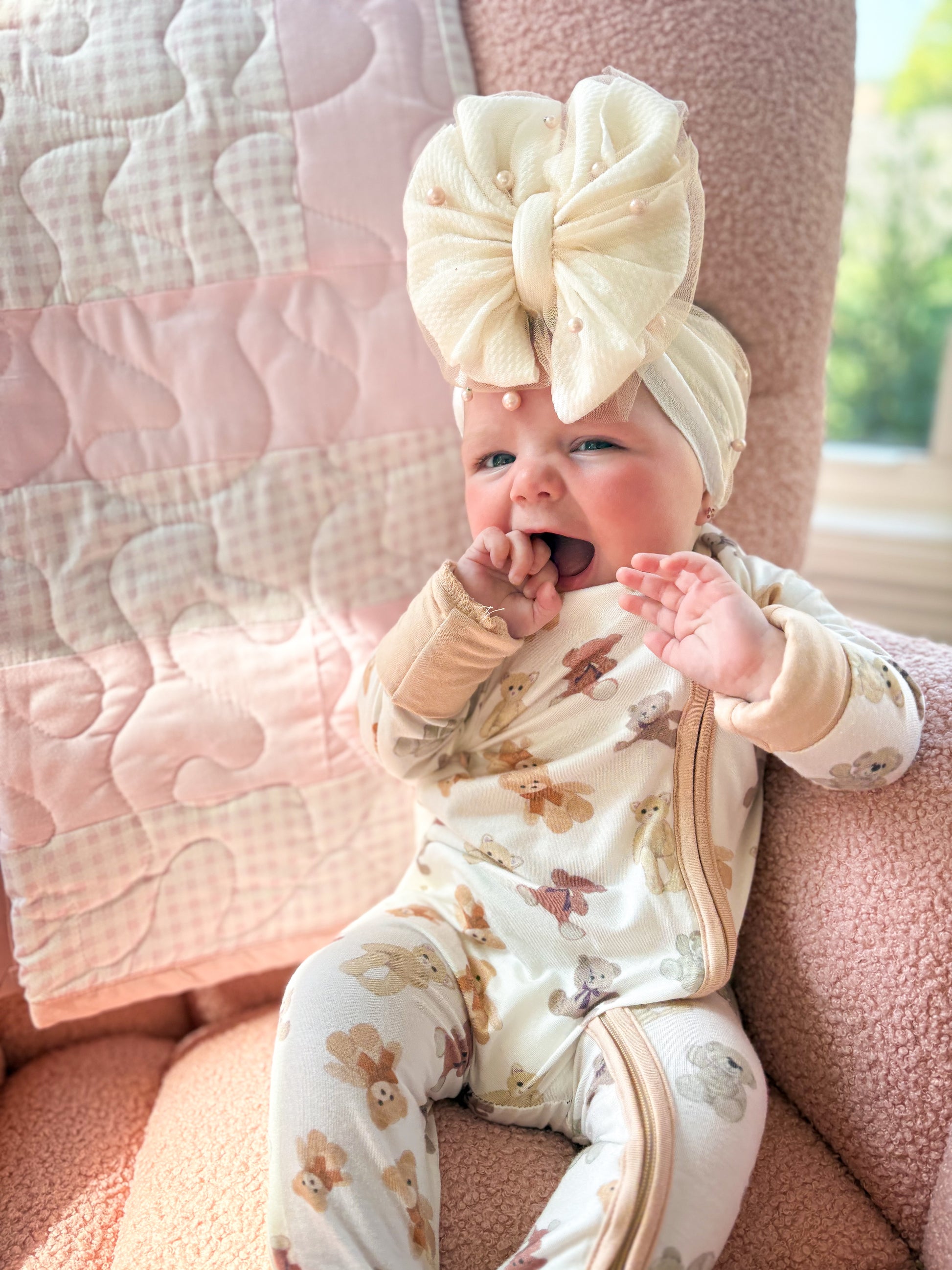 Your little cub will be wrapped in the coziest kind of comfort with our Cuddle Cub Bamboo Sleeper. Featuring a sweet teddy bear print in soft neutral tones, this sleeper is as gentle as a snuggle. Crafted from our signature buttery-soft bamboo blend, it’s breathable, stretchy, and perfect for sensitive skin. Designed with a double zipper for quick changes and fold-over cuffs to keep tiny hands and feet cozy — it’s the ultimate blend of comfort and cuteness for your baby’s everyday adventures.