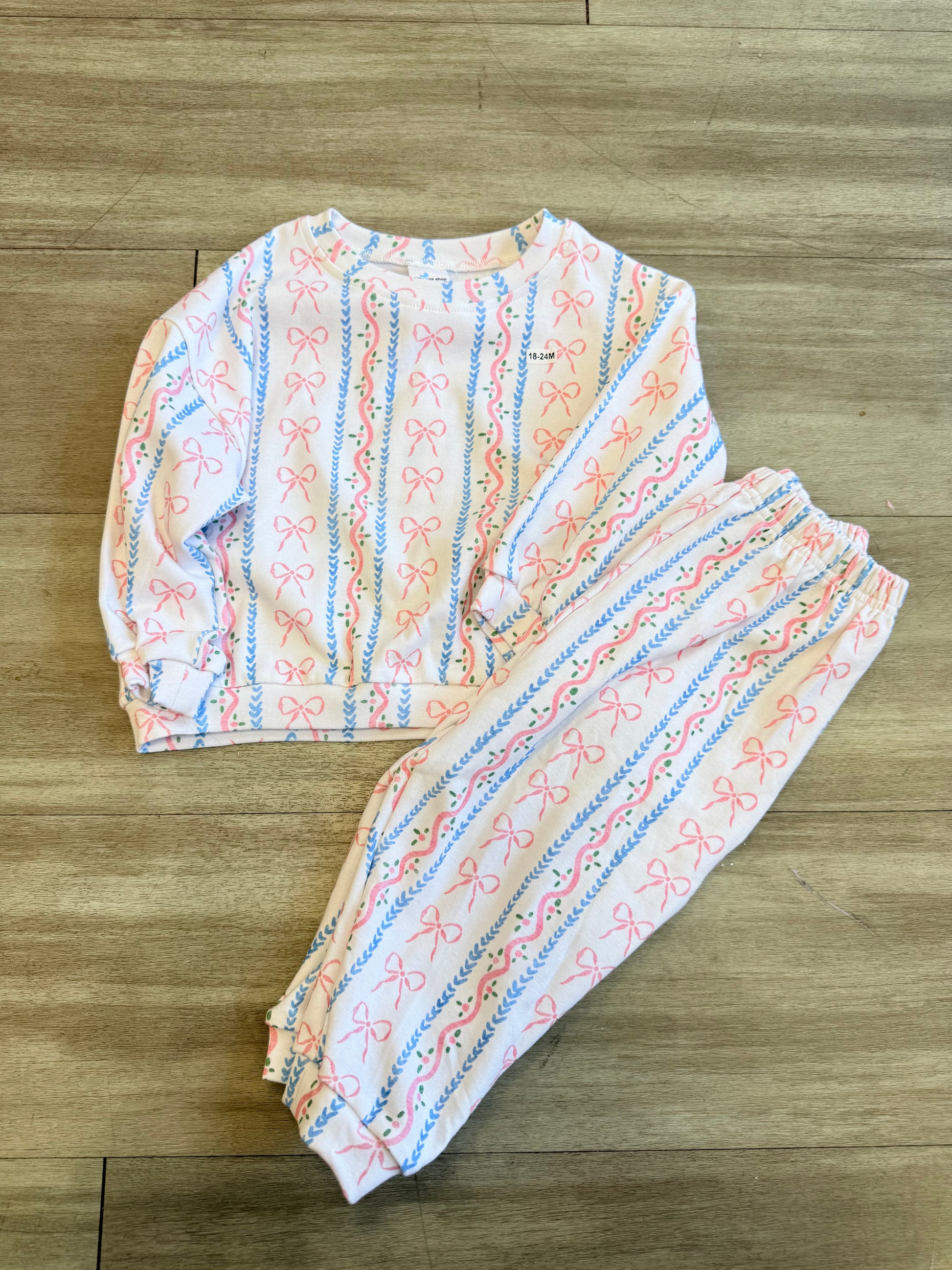 Sweet, soft, and made for cozy little days — the Dainty Bow Sweatsuit blends comfort with timeless charm. Featuring an allover pastel bow design with dainty vine detailing, this set offers that feminine, classic look while keeping your little one snug and comfy.