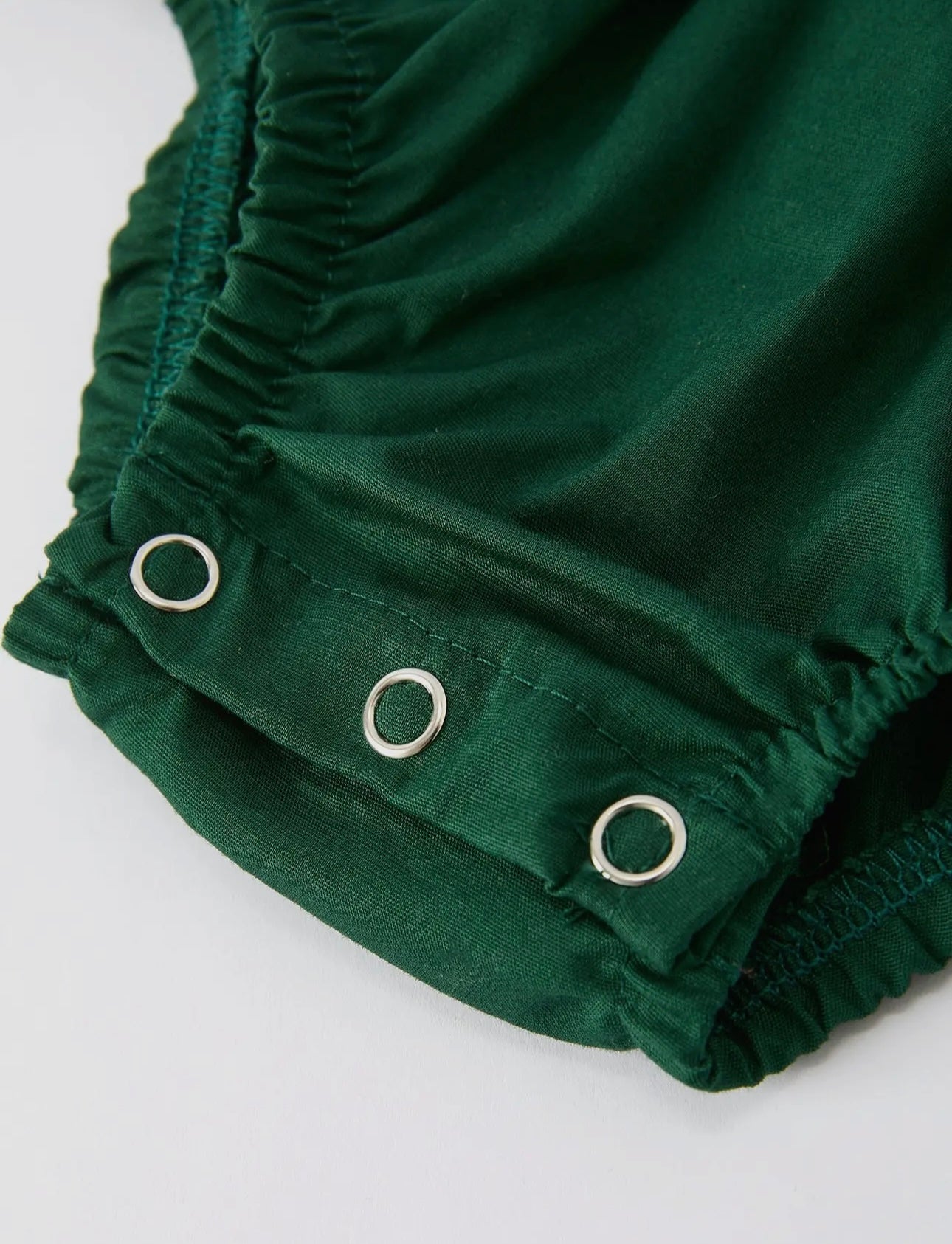 The Little Saint Nick Bow Bubble captures classic holiday charm with its deep evergreen fabric, puff sleeves, and sweet Peter Pan collar trimmed in festive red stitching. ✨