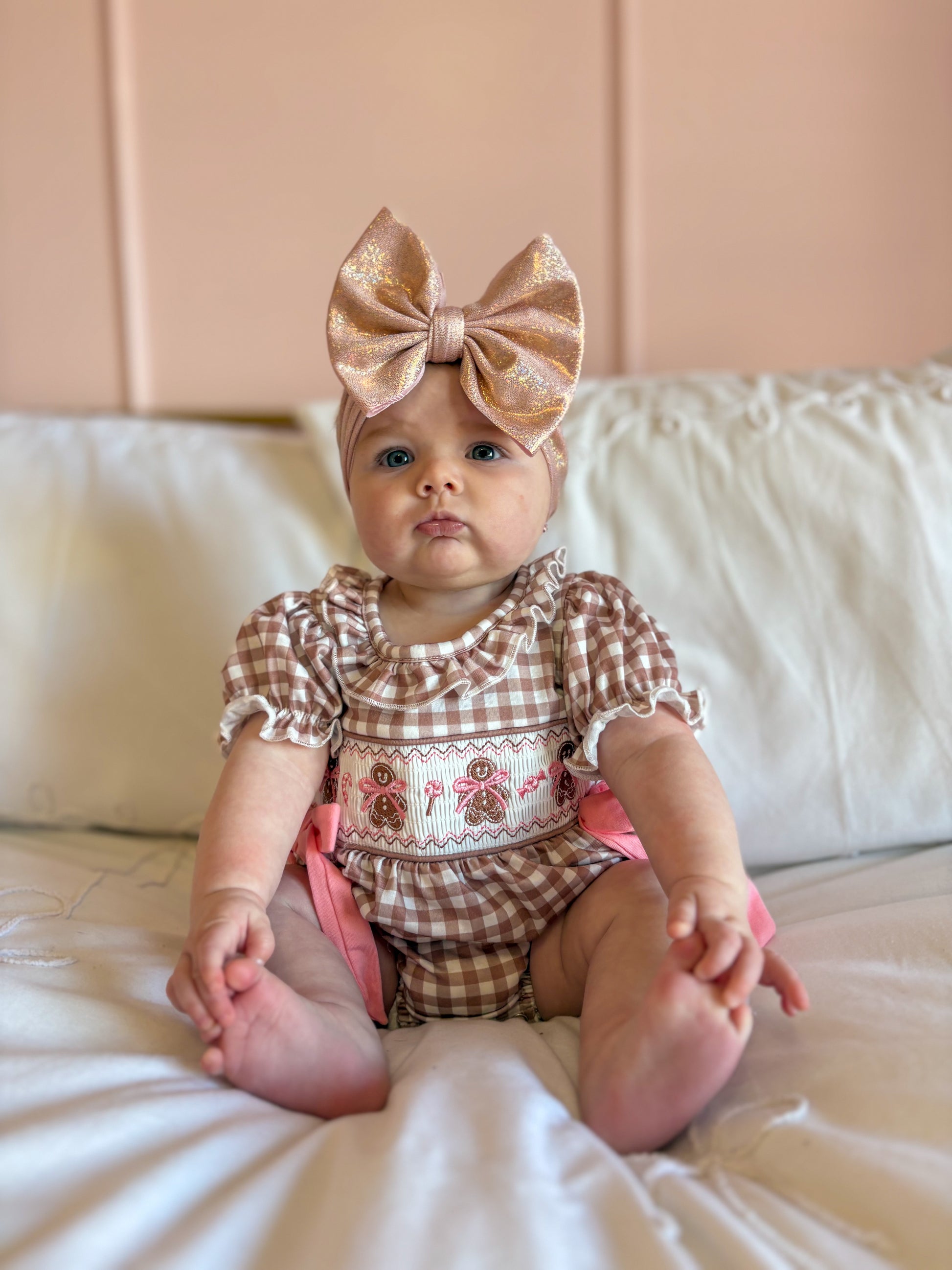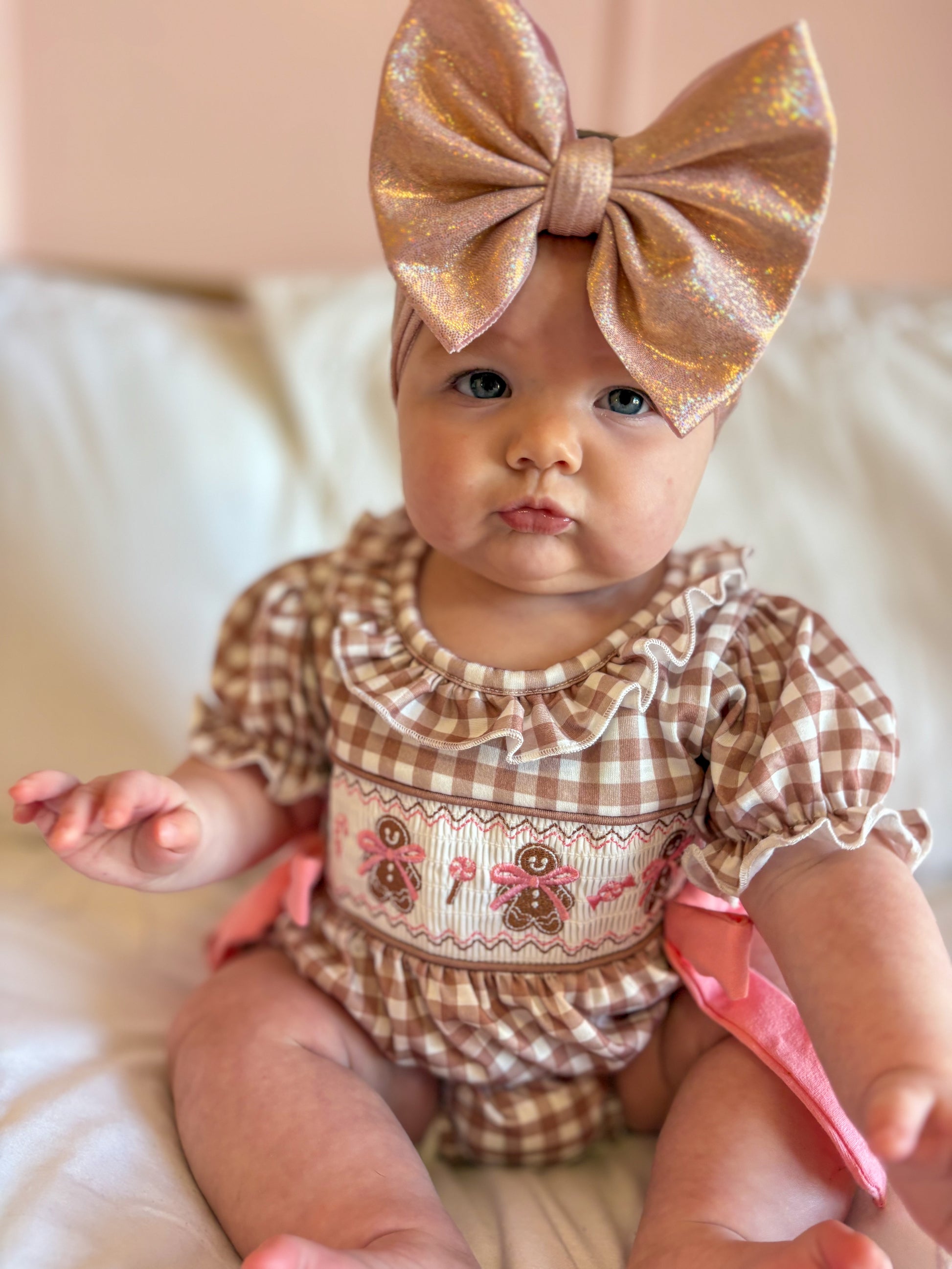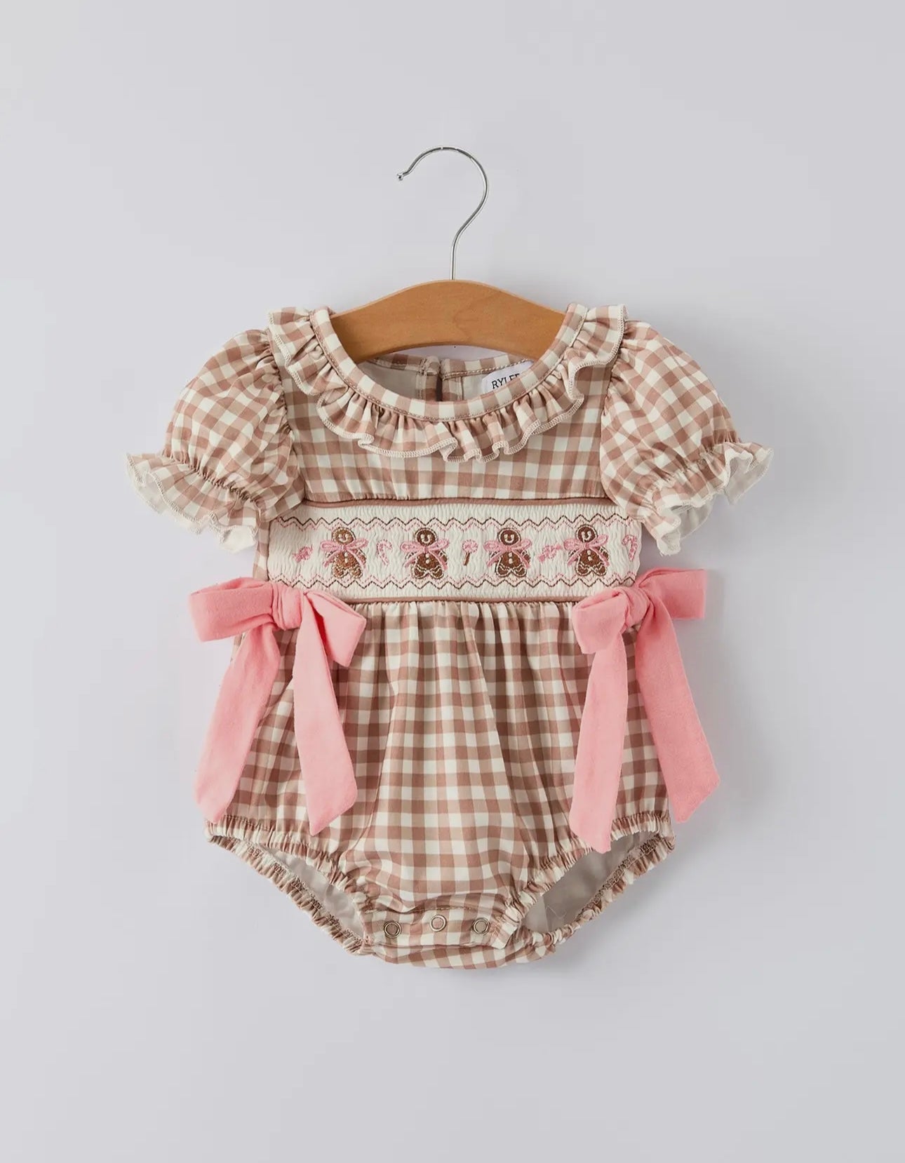 A holiday treat come to life — our Miss Ginger Snap Bubble is a darling mix of classic charm and festive sweetness. Featuring soft mocha-and-white gingham with hand-smocked gingerbread girls and dainty pink bows, this romper is made for Christmas memories. The ruffled neckline, puff sleeves, and pink side ties add just the right touch of whimsy, while the stretchy leg openings and back button closure ensure an easy, comfy fit.