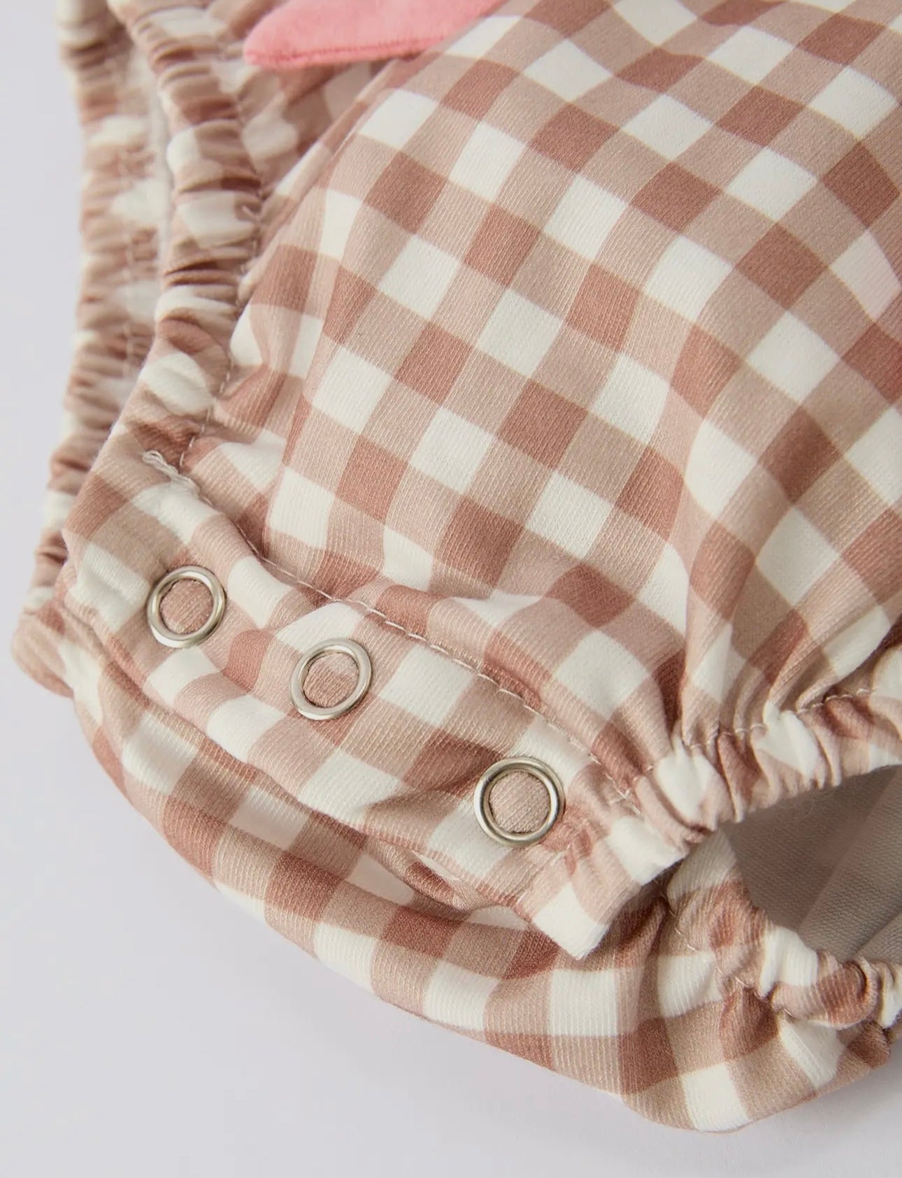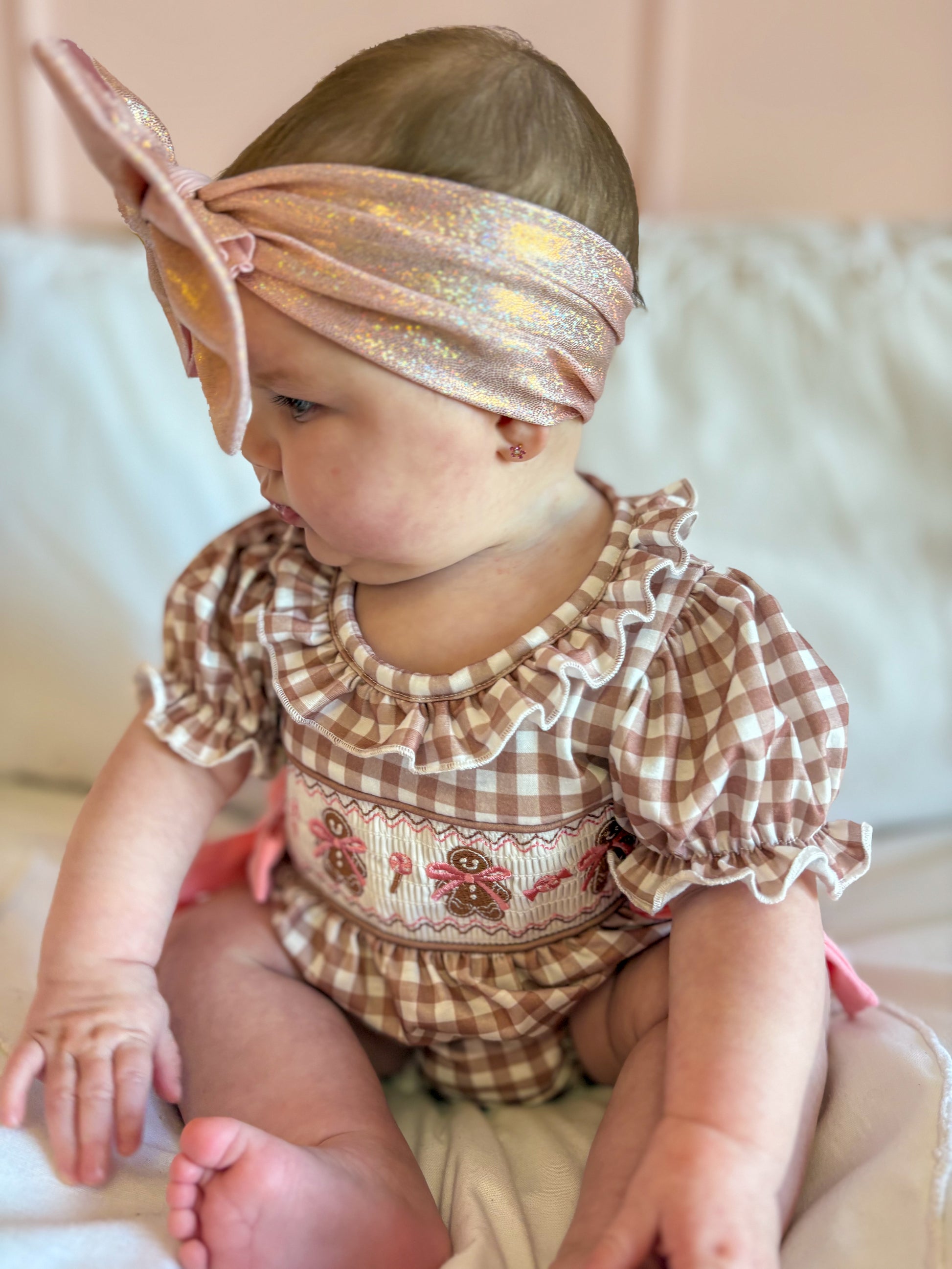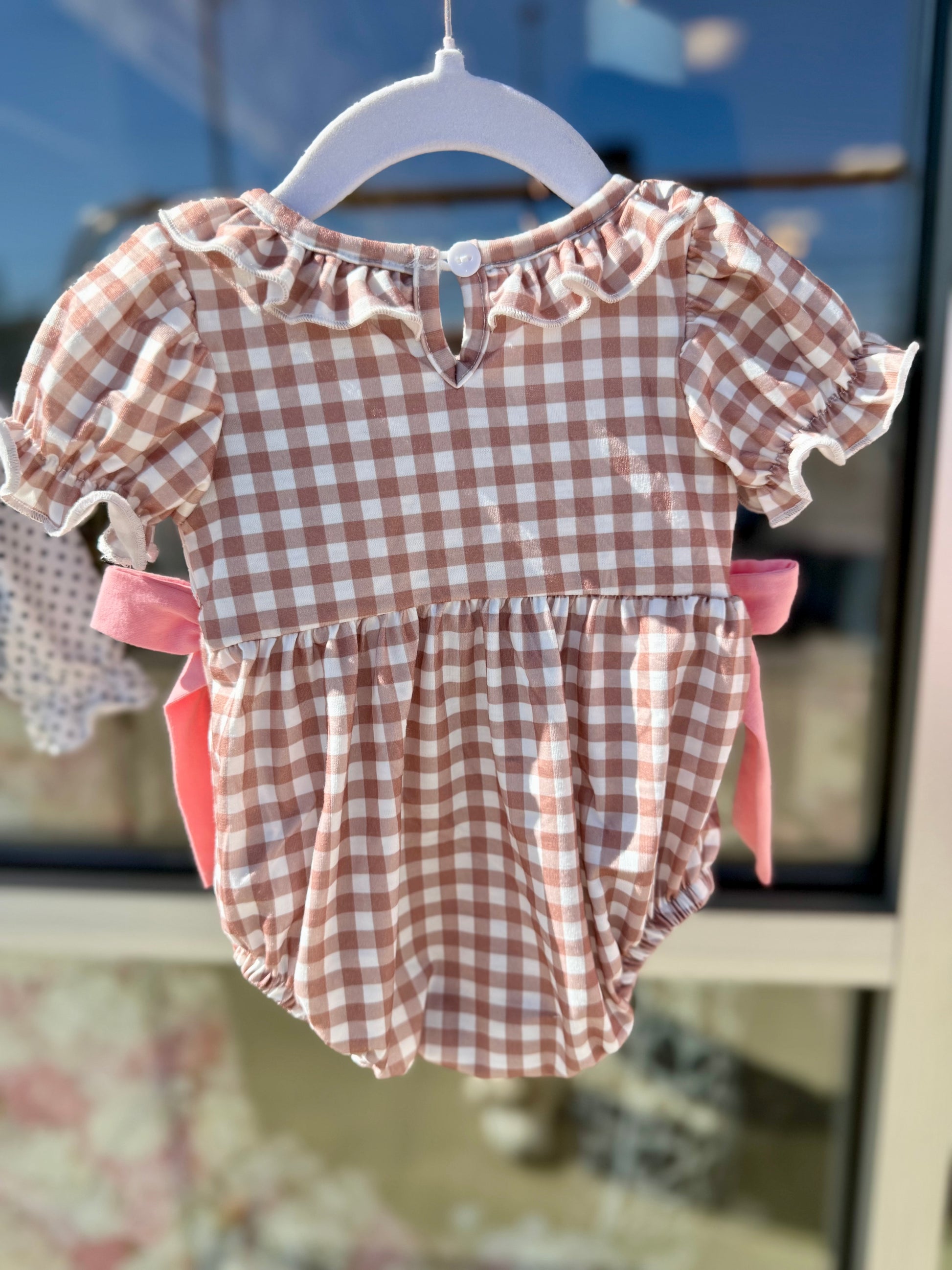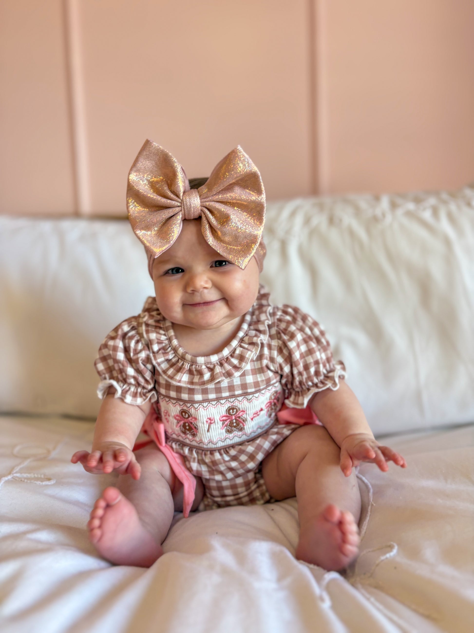A holiday treat come to life — our Miss Ginger Snap Bubble is a darling mix of classic charm and festive sweetness. Featuring soft mocha-and-white gingham with hand-smocked gingerbread girls and dainty pink bows, this romper is made for Christmas memories. The ruffled neckline, puff sleeves, and pink side ties add just the right touch of whimsy, while the stretchy leg openings and back button closure ensure an easy, comfy fit.