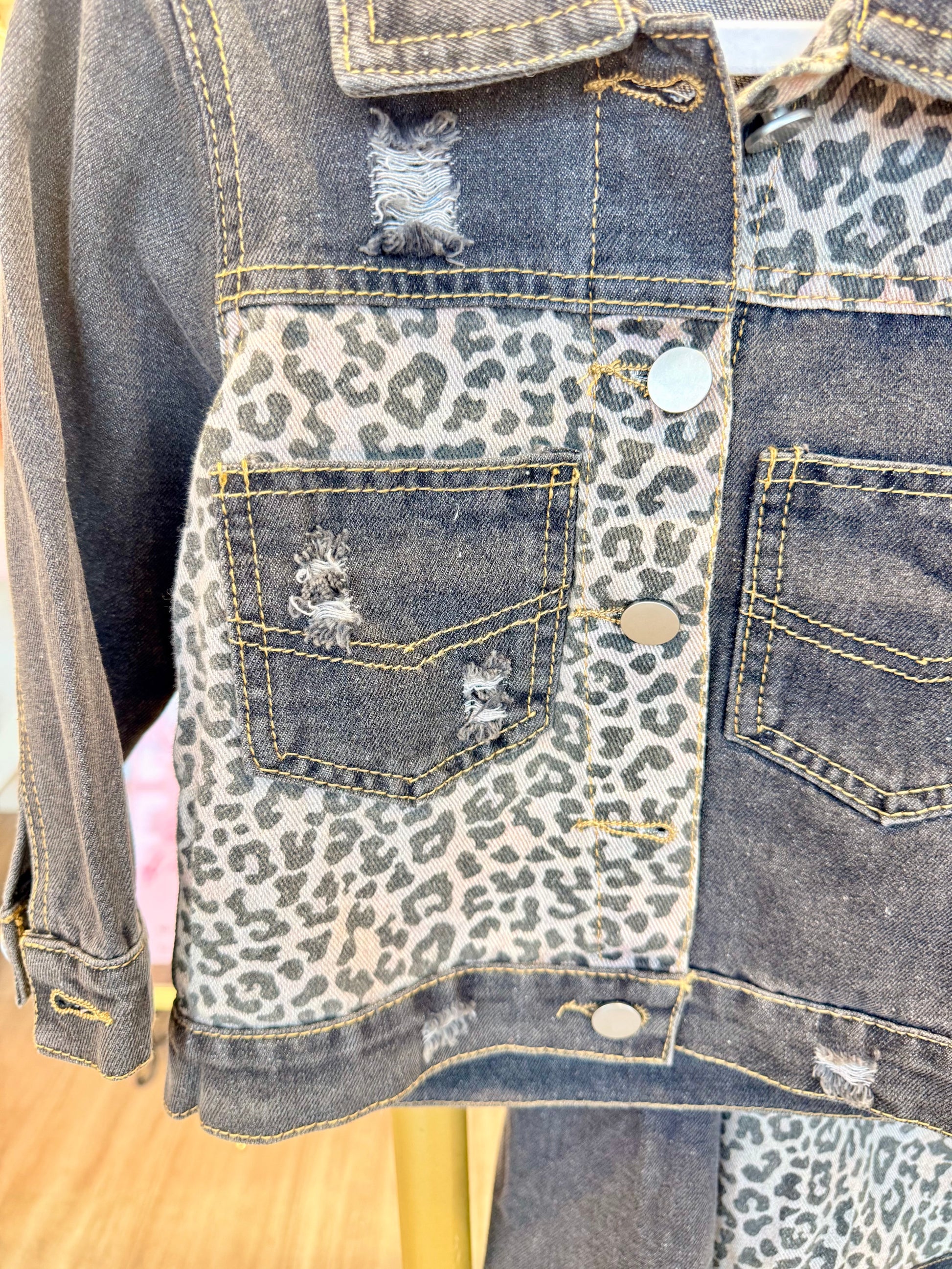 Made with soft, lightweight denim and detailed with leopard print contrast panels, gentle distressing, and functional pockets — it’s the jacket that turns every outing into a matching moment.