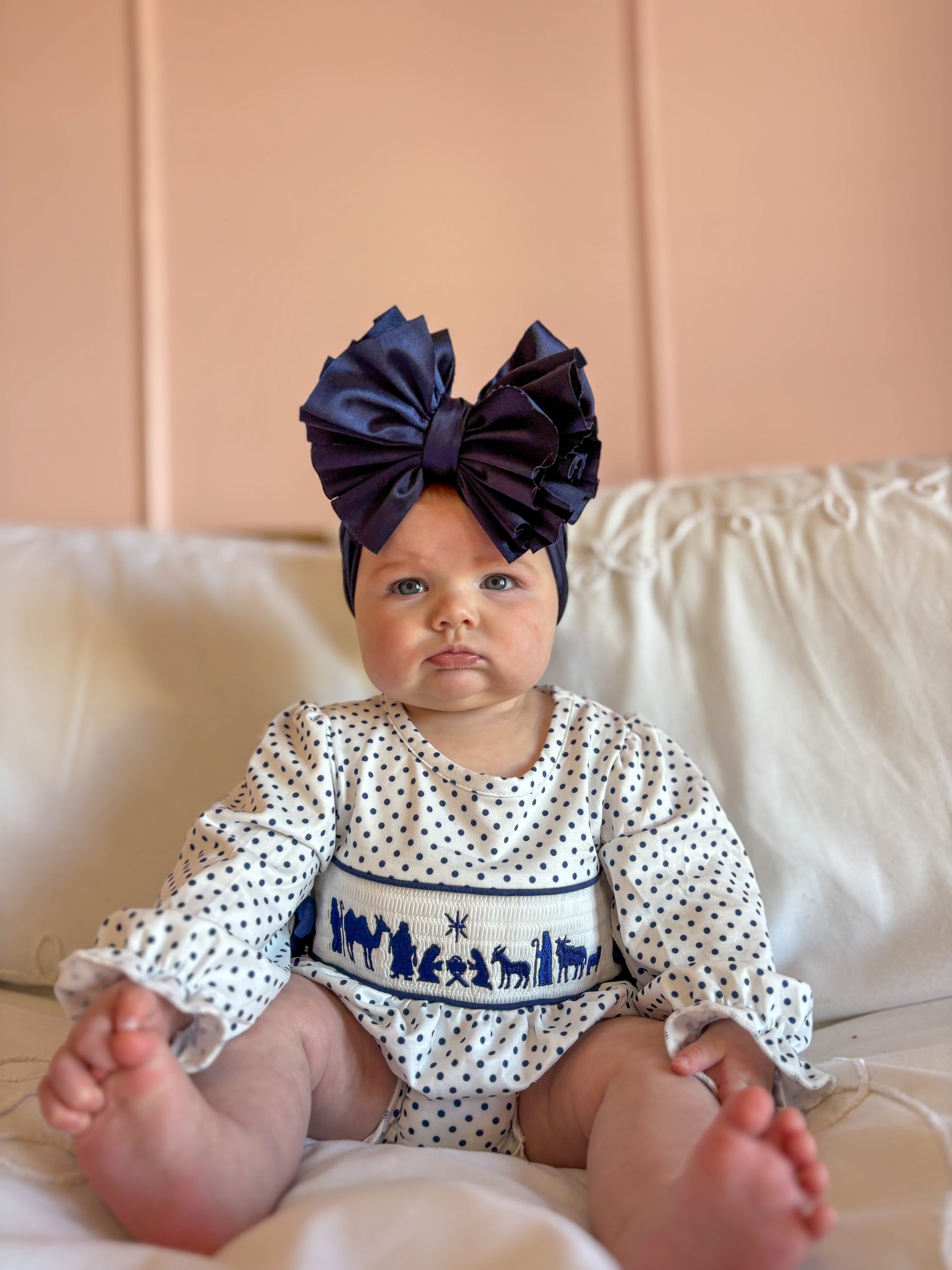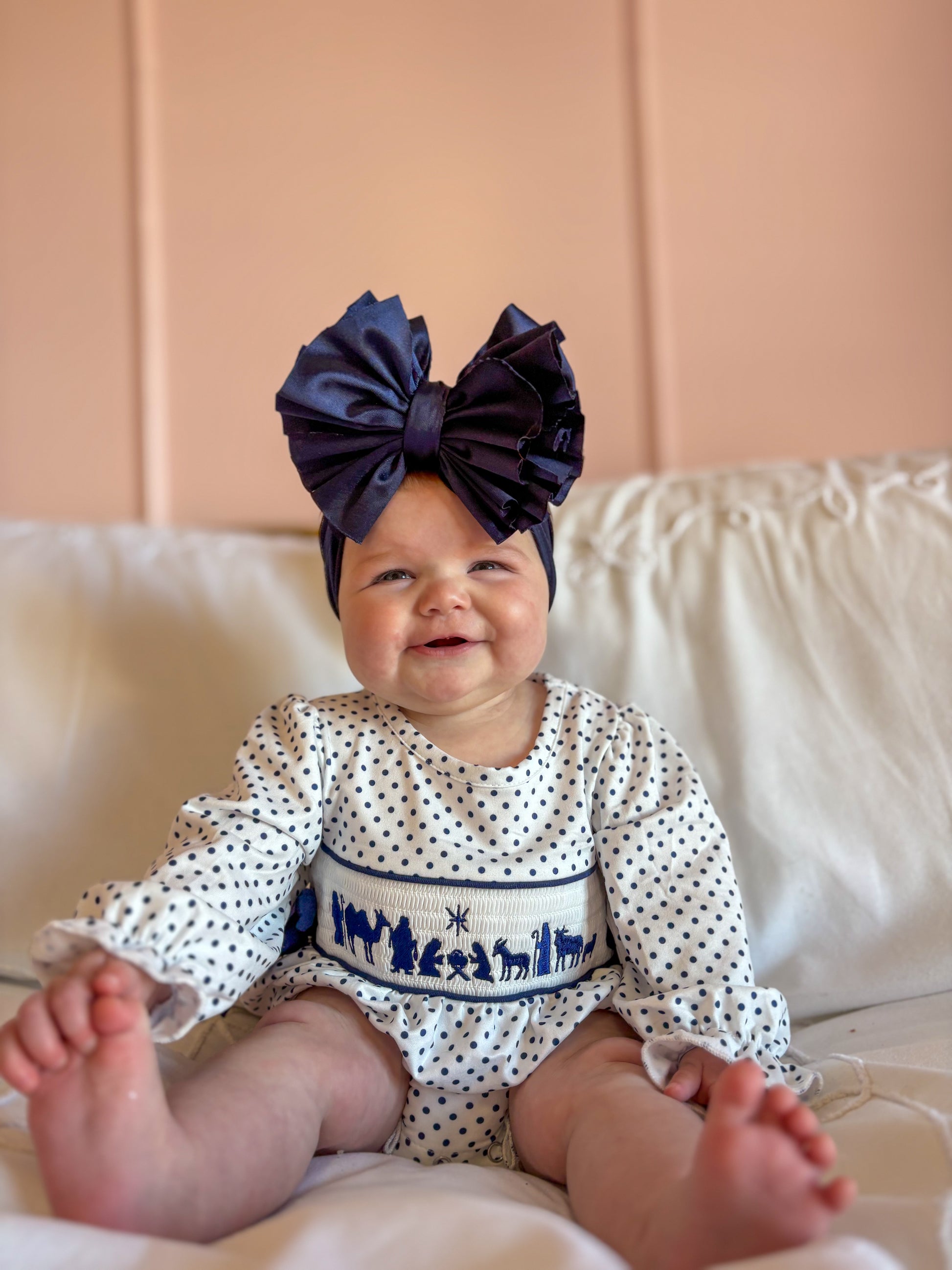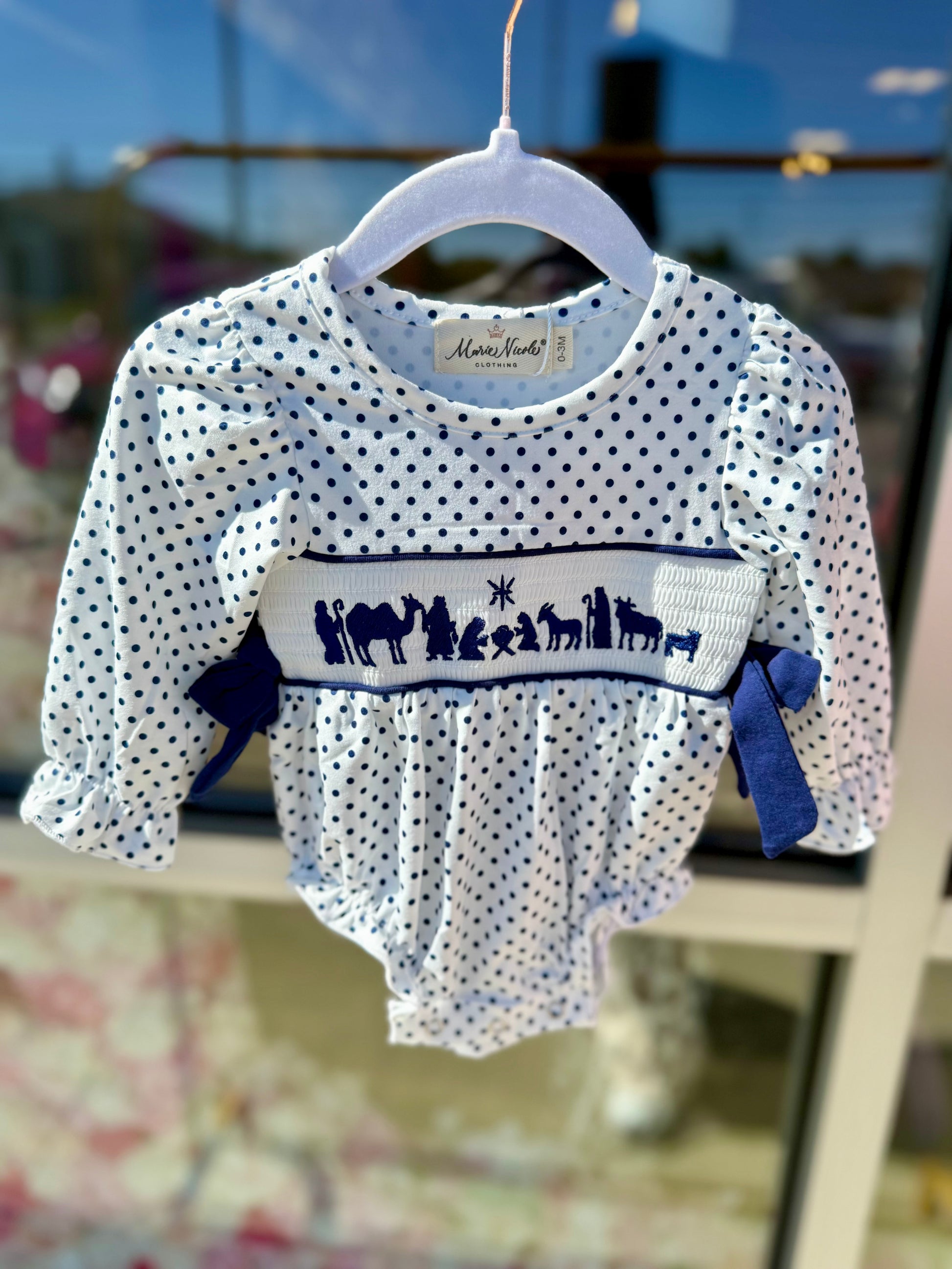 A timeless piece that beautifully captures the reason for the season — our O Holy Night Smocked Bubble is pure Christmas elegance. This sweet bubble features a navy-and-white polka dot print with a hand-smocked Nativity scene across the chest, complete with dainty navy bows at the sides. The long puff sleeves and ruffled cuffs add a classic touch, making it perfect for church services, family gatherings, or holiday portraits.