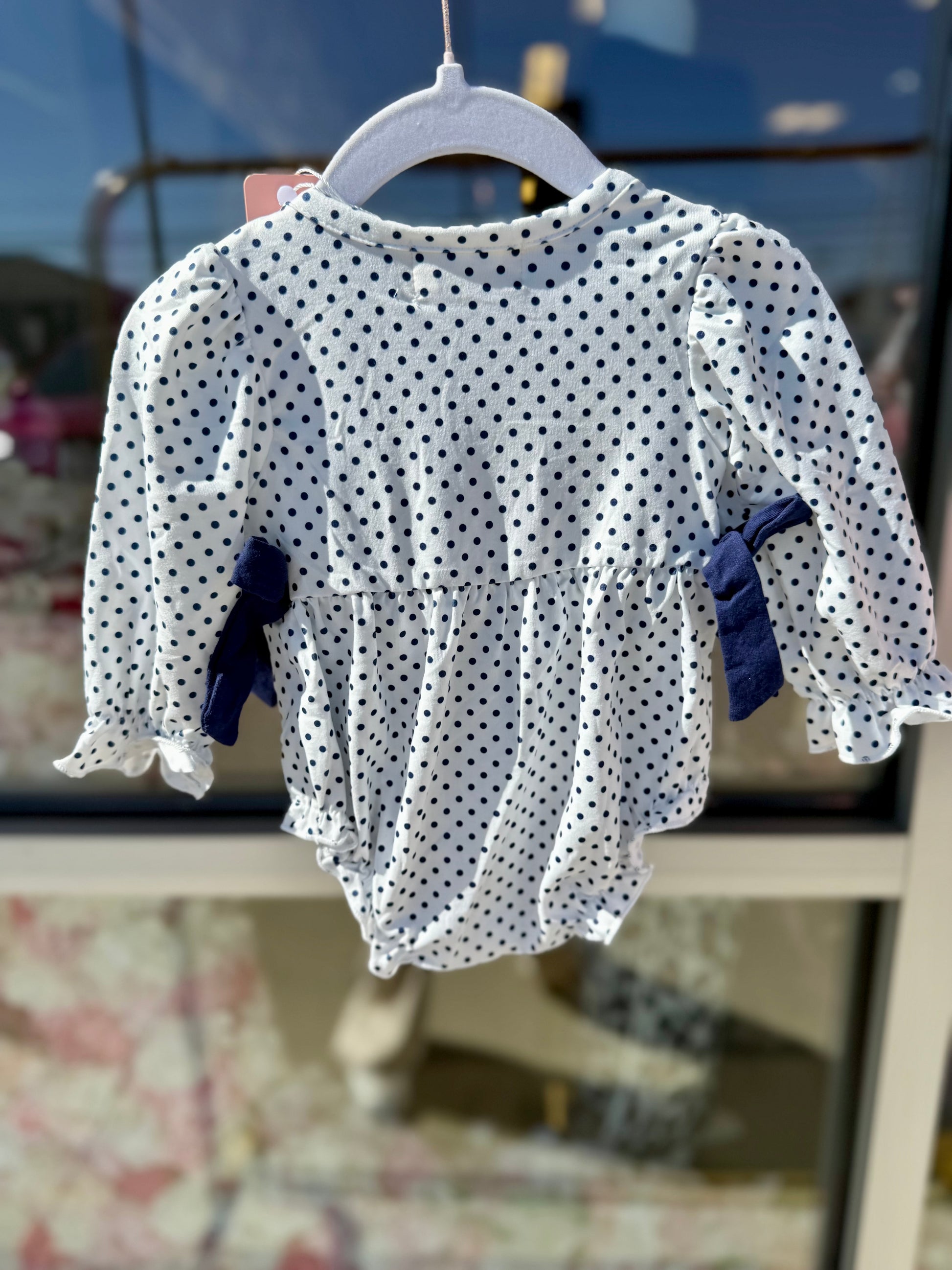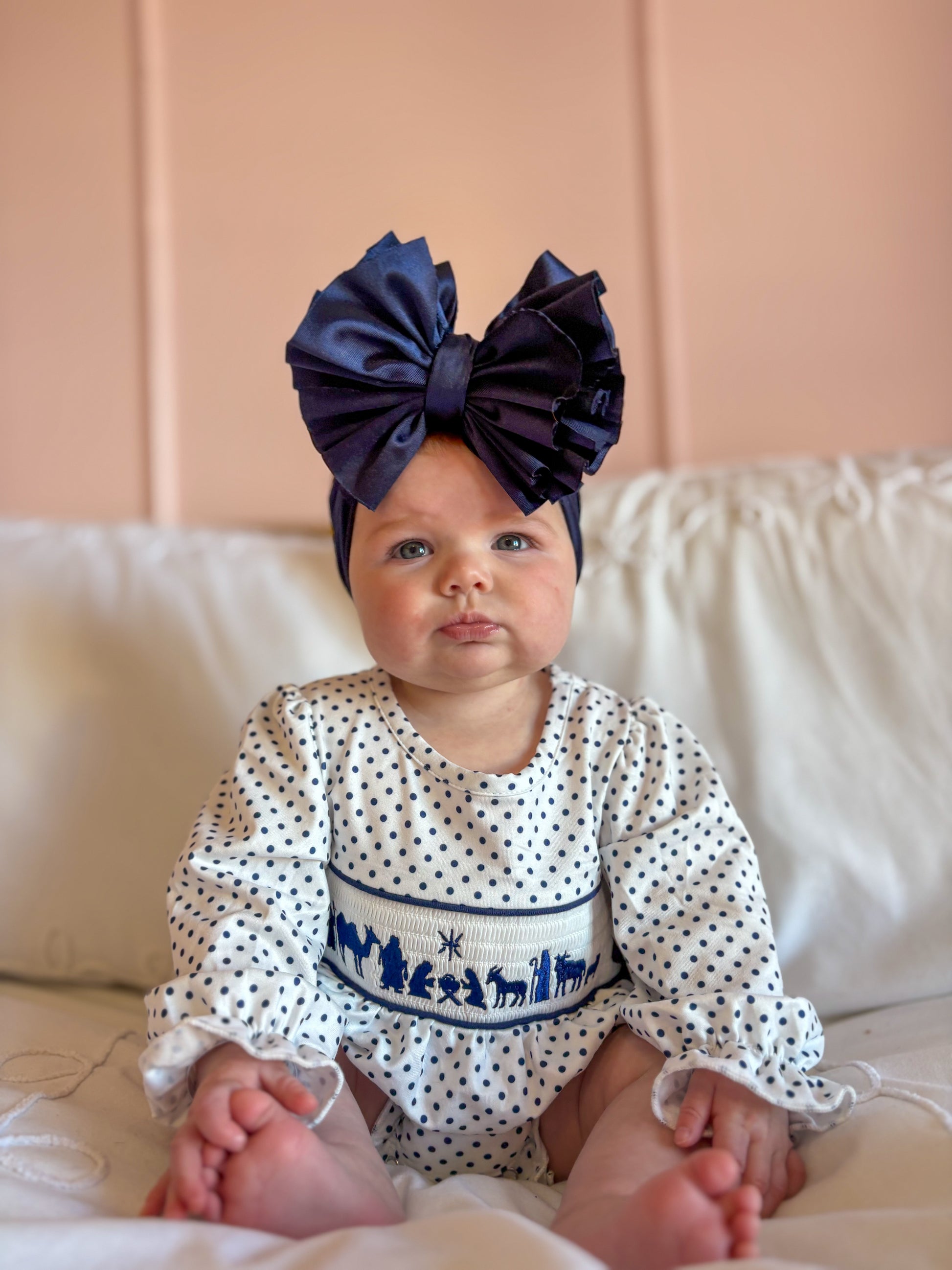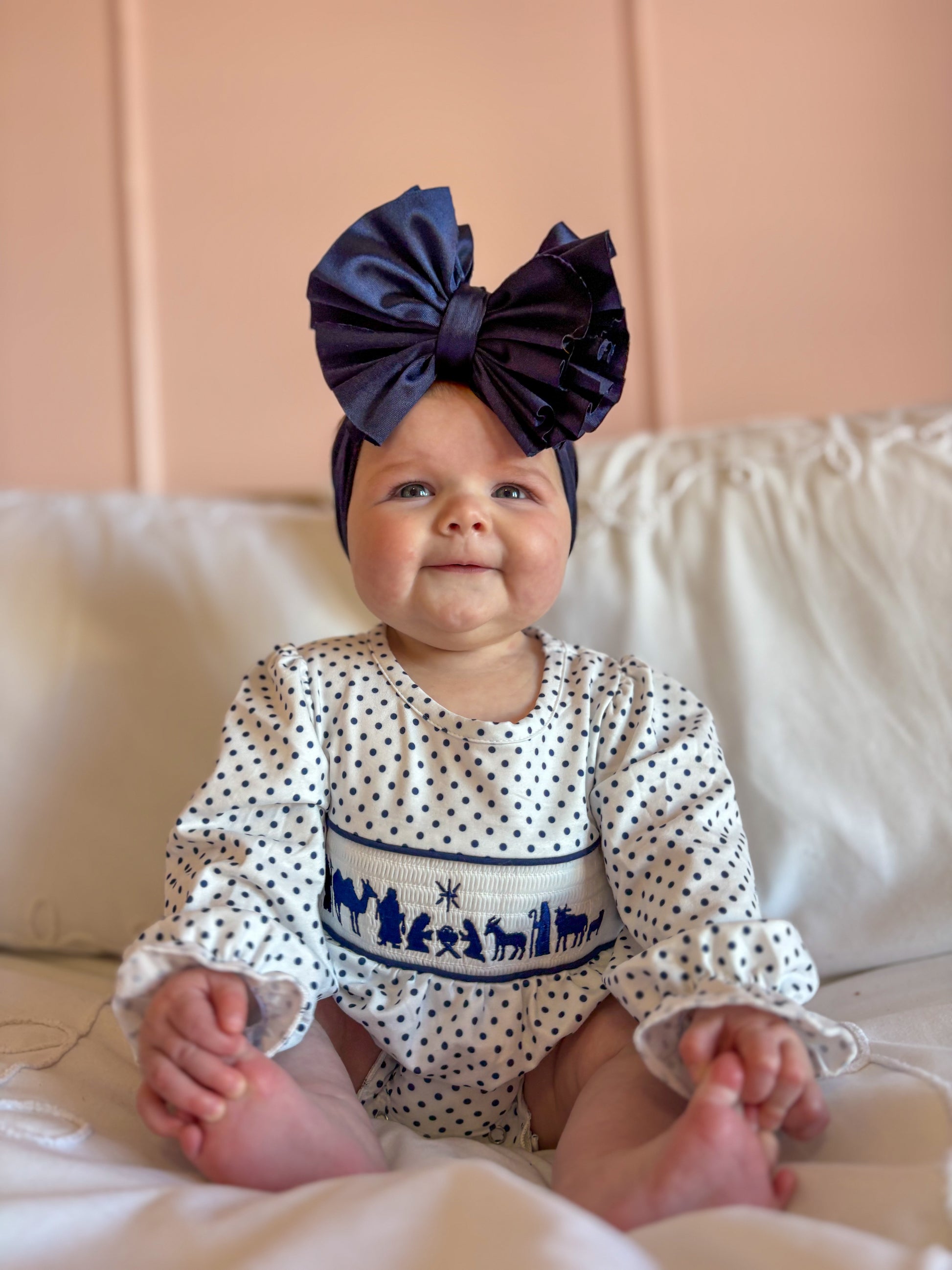 A timeless piece that beautifully captures the reason for the season — our O Holy Night Smocked Bubble is pure Christmas elegance. This sweet bubble features a navy-and-white polka dot print with a hand-smocked Nativity scene across the chest, complete with dainty navy bows at the sides. The long puff sleeves and ruffled cuffs add a classic touch, making it perfect for church services, family gatherings, or holiday portraits.