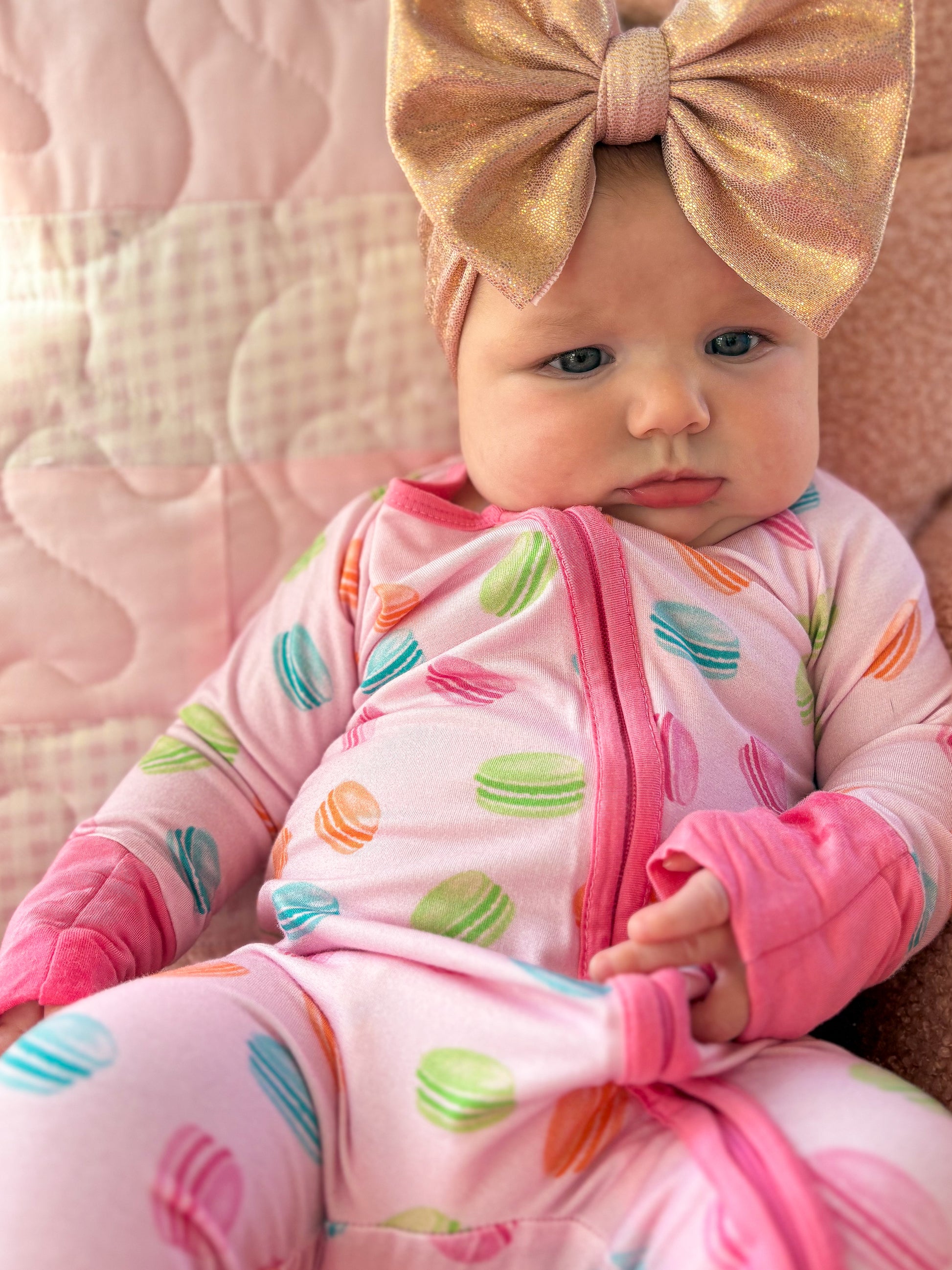 Your little one will look good enough to eat in our Sweet as a Macaron Bamboo Sleeper! Featuring pastel rainbow macarons on a blush pink background, this yummy-cute print is perfect for cozy naps and bedtime cuddles. Crafted from our signature buttery bamboo blend, it’s ultra-soft, stretchy, and breathable—ideal for sensitive skin. The double zipper makes changes a breeze, while fold-over cuffs keep little hands and feet warm and safe.